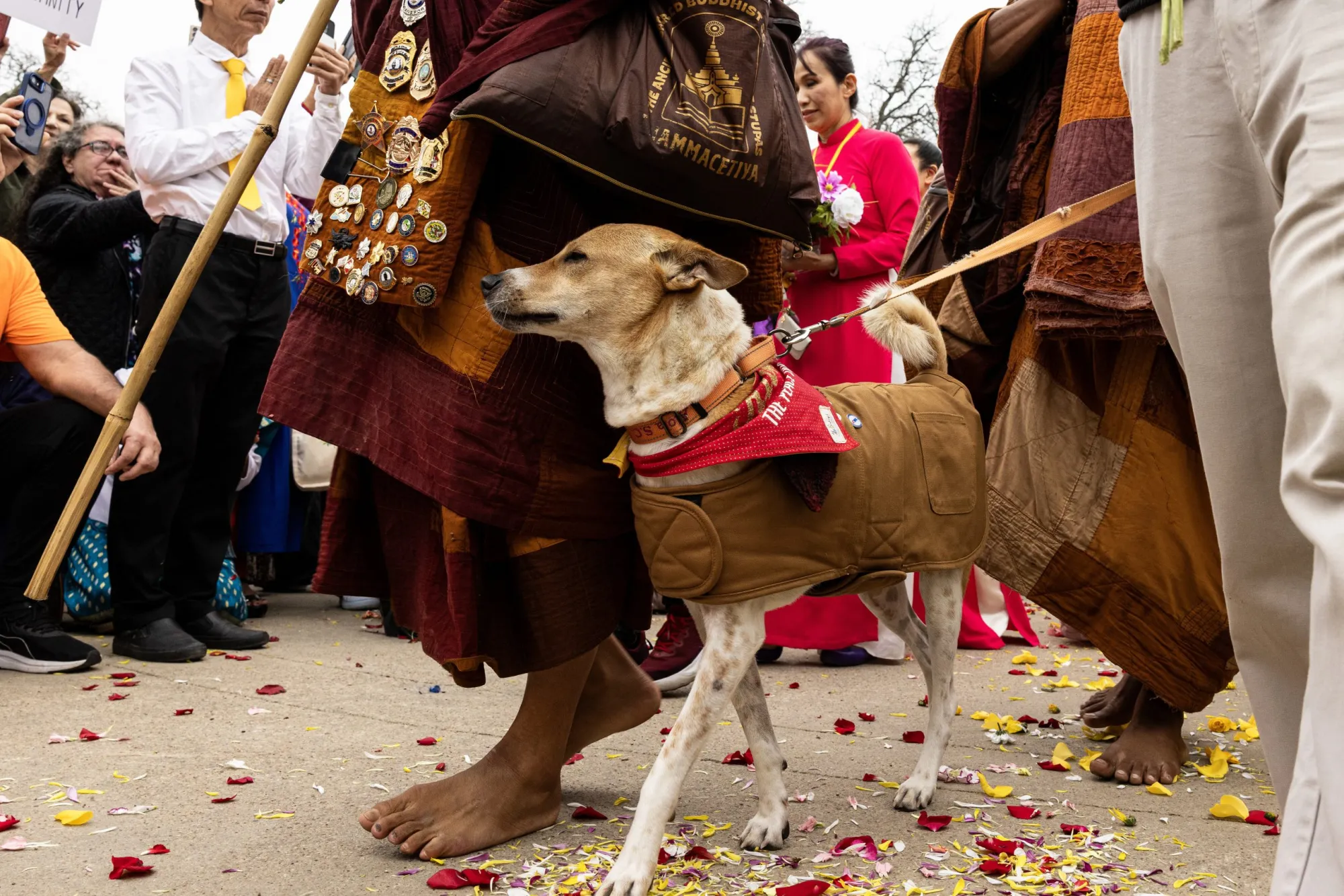 Nearly two dozen Buddhist monks who with their dog Aloka participated in a cross-country Walk for Peace return to the Huong Dao Vipassana Bhavana Center in east Fort Worth on Feb. 14, marking 112 days since their departure.