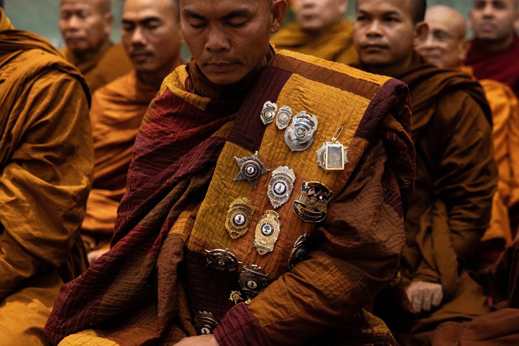 Bhikkhu Pannakara, also known as Rev. Nguyen, wears pins of various police departments and agencies from across the nation at the Huong Dao Vipassana Bhavana Center on Feb. 14, 2026. (Maria Crane | Fort Worth Report/CatchLight Local/Report for America)
