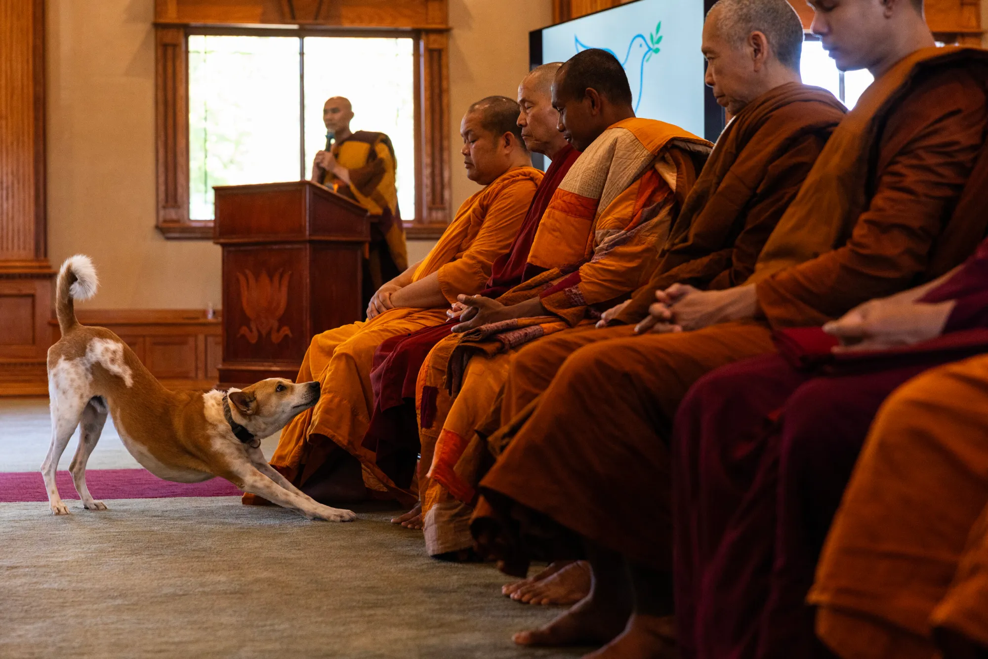 Monks sit at the front of the Huong Dao Vipassana Bhavana Center in Fort Worth during a press conference on Oct. 19, 2025, announcing the Walk for Peace. (Maria Crane | Fort Worth Report/CatchLight Local/Report for America)