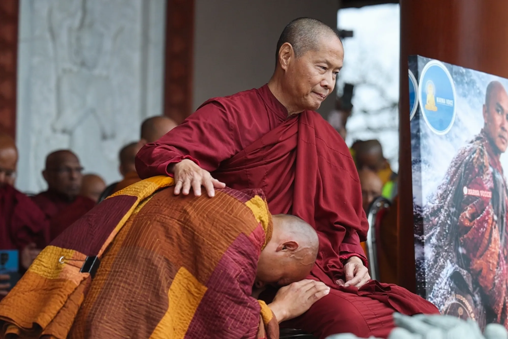 Bhikkhu Pannakara, also known as Rev. Nguyen, (left) bows down in reverence to Venerable Ratanaguṇa, abbot of Huong Dao Vipassana Bhavana Center, during the Fort Worth monks’ homecoming Feb. 14, 2026. (Christine Vo | Fort Worth Report)