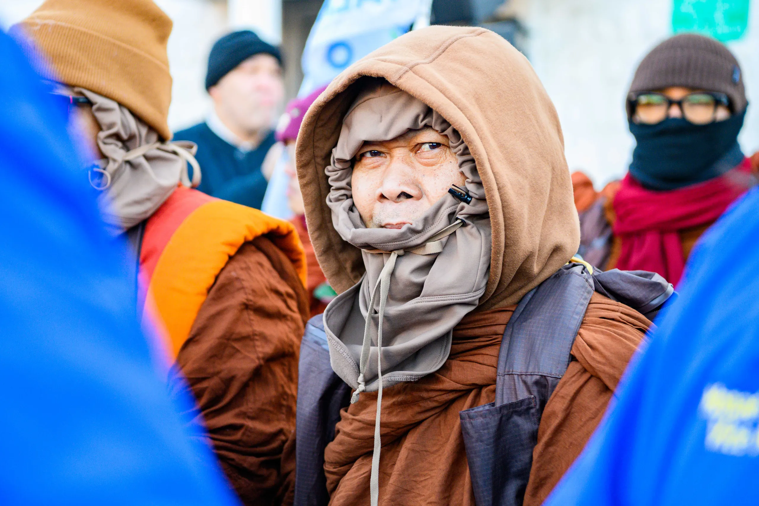 One of the venerable monks participating in the Walk for Peace is bundled up to endure the frigid temperatures the group endured on their journey through southeastern Prince William County on Feb. 7, 2026. (Doug Stroud for Prince William Times)