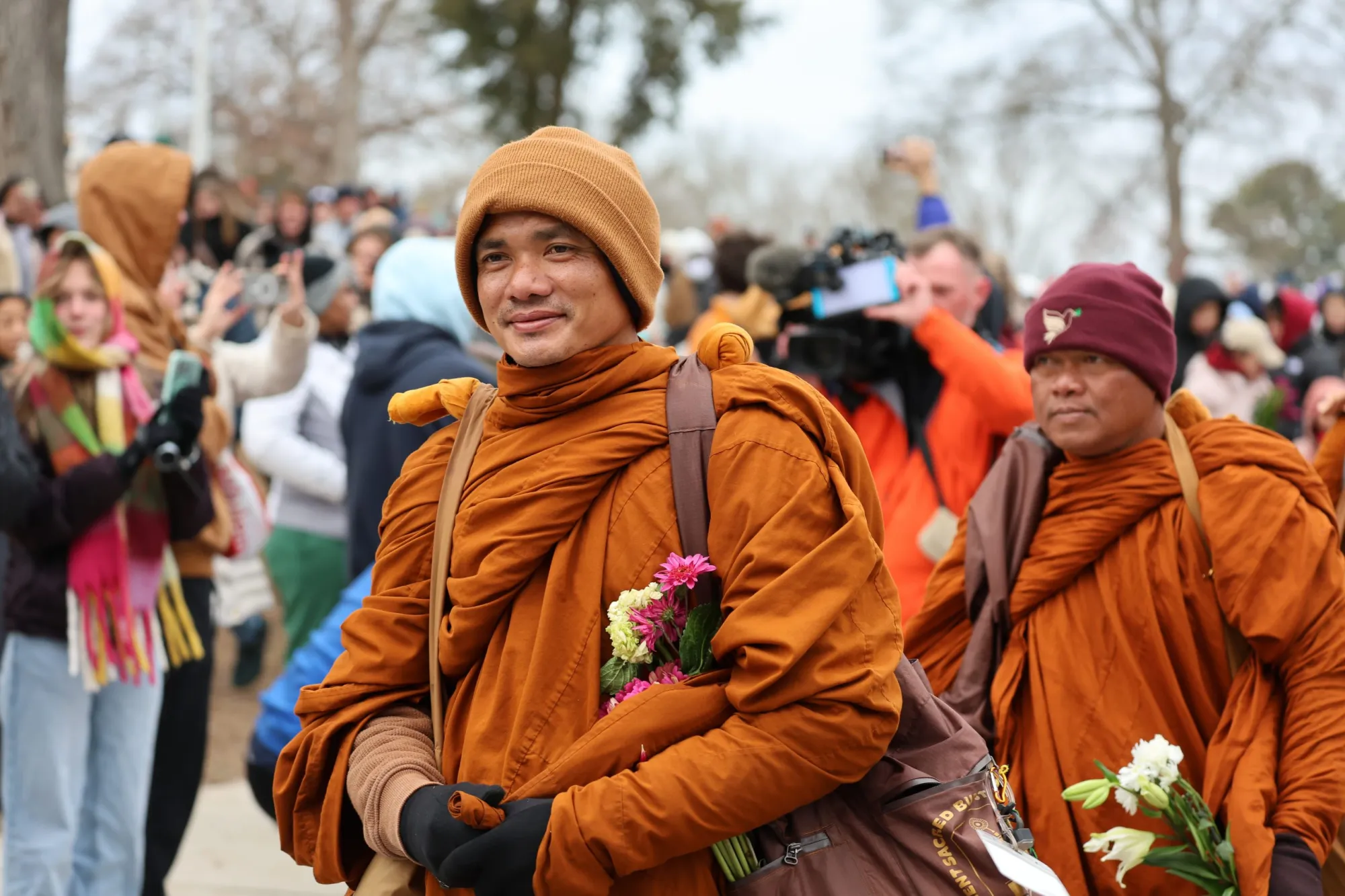 Despite the cold weather, thousands gathered in Raleigh, North Carolina, on Jan. 24, 2026, to see the Fort Worth Buddhist monks on their Walk for Peace journey. Walter Gómez | Enlace Latino NC