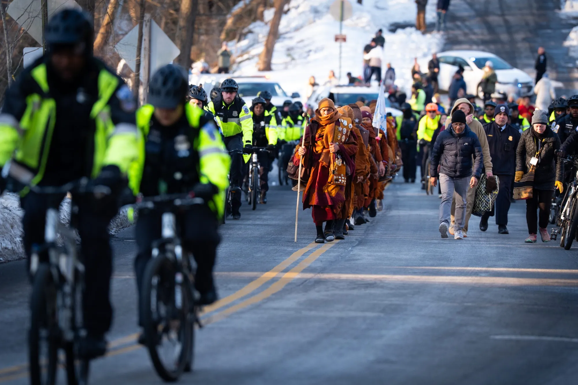 Buddhist monks walk up Arizona Avenue NW in the Walk for Peace initiative Feb. 10, 2026, shortly after crossing into Washington, D.C. (Sarah L. Voisin for Fort Worth Report)