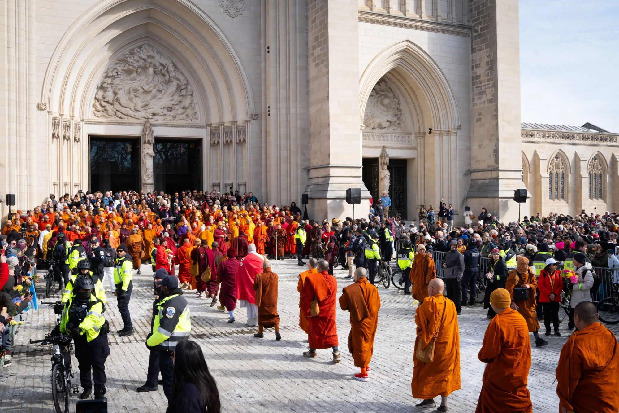 Buddhist monks participating in the Walk for Peace arrive at the Washington National Cathedral on Tuesday, Feb. 10, 2026, in Washington, D.C. Thousands came out to see them. (Sarah L. Voisin for Fort Worth Report)
