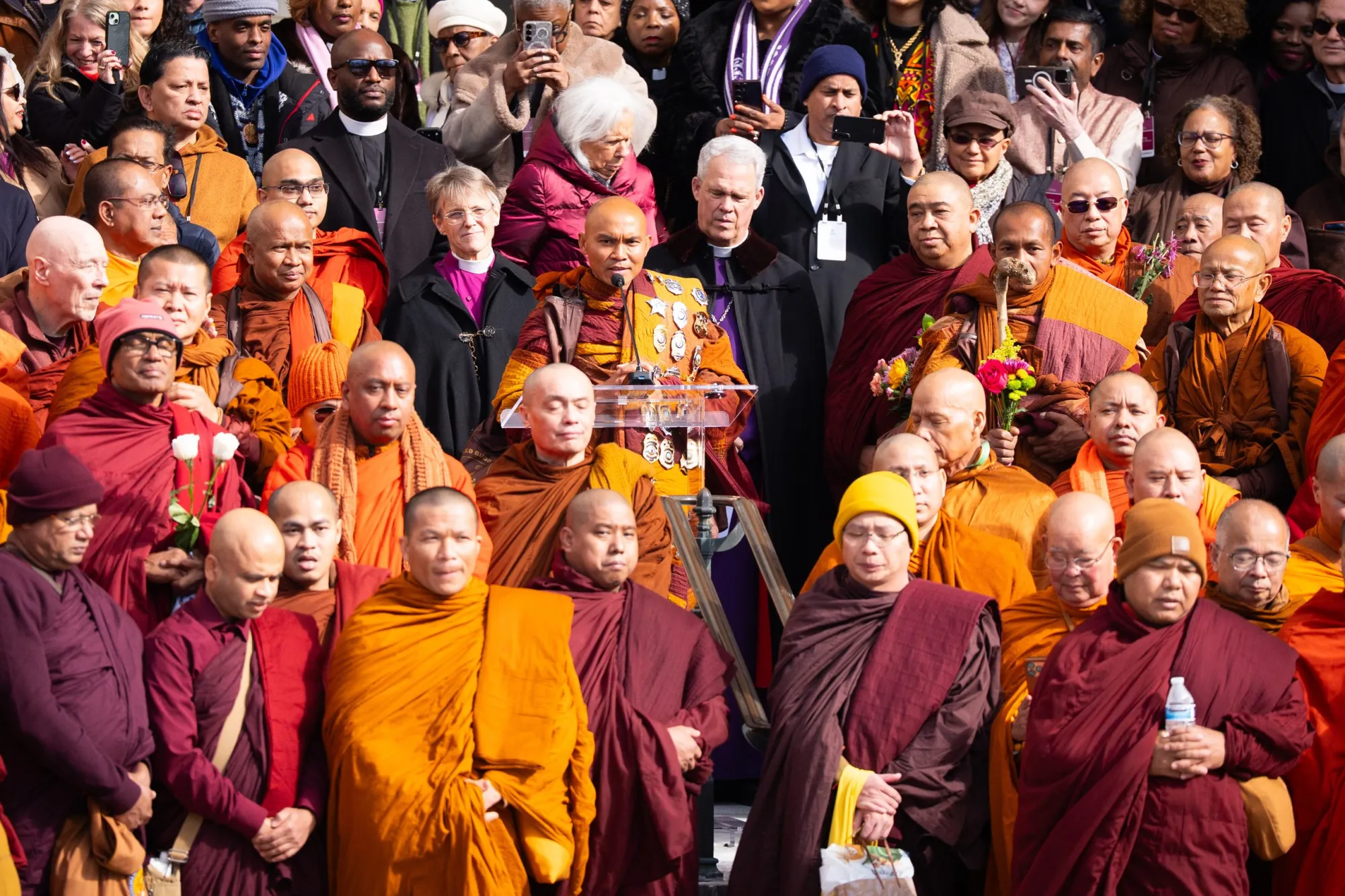 Venerable Bhikkhu Pannakara speaks to the crowd at the Washington National Cathedral on Feb. 10, 2026, in Washington, D.C. (Sarah L. Voisin for Fort Worth Report)