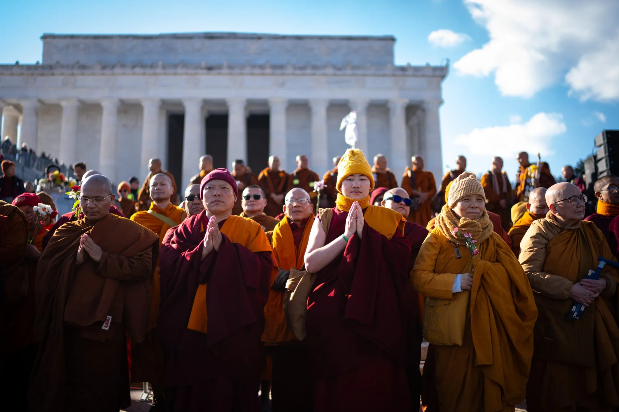 Buddhist monks participating in the Walk for Peace hold a peace gathering and concluding ceremony at Lincoln Memorial in Washington, D.C., on Day 109, Feb. 11, 2026. (Sarah L. Voisin for Fort Worth Report)