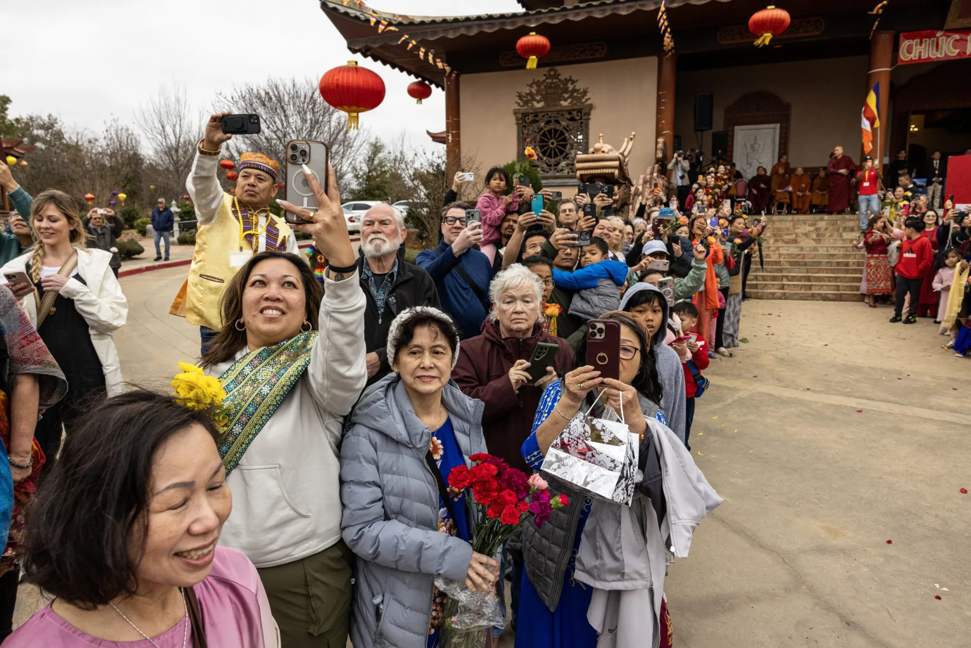 Cientos de personas esperan la llegada de los monjes al Centro Huong Dao Vipassana Bhavana el 14 de febrero de 2026. (Maria Crane | Fort Worth Report/CatchLight Local/Report for America)