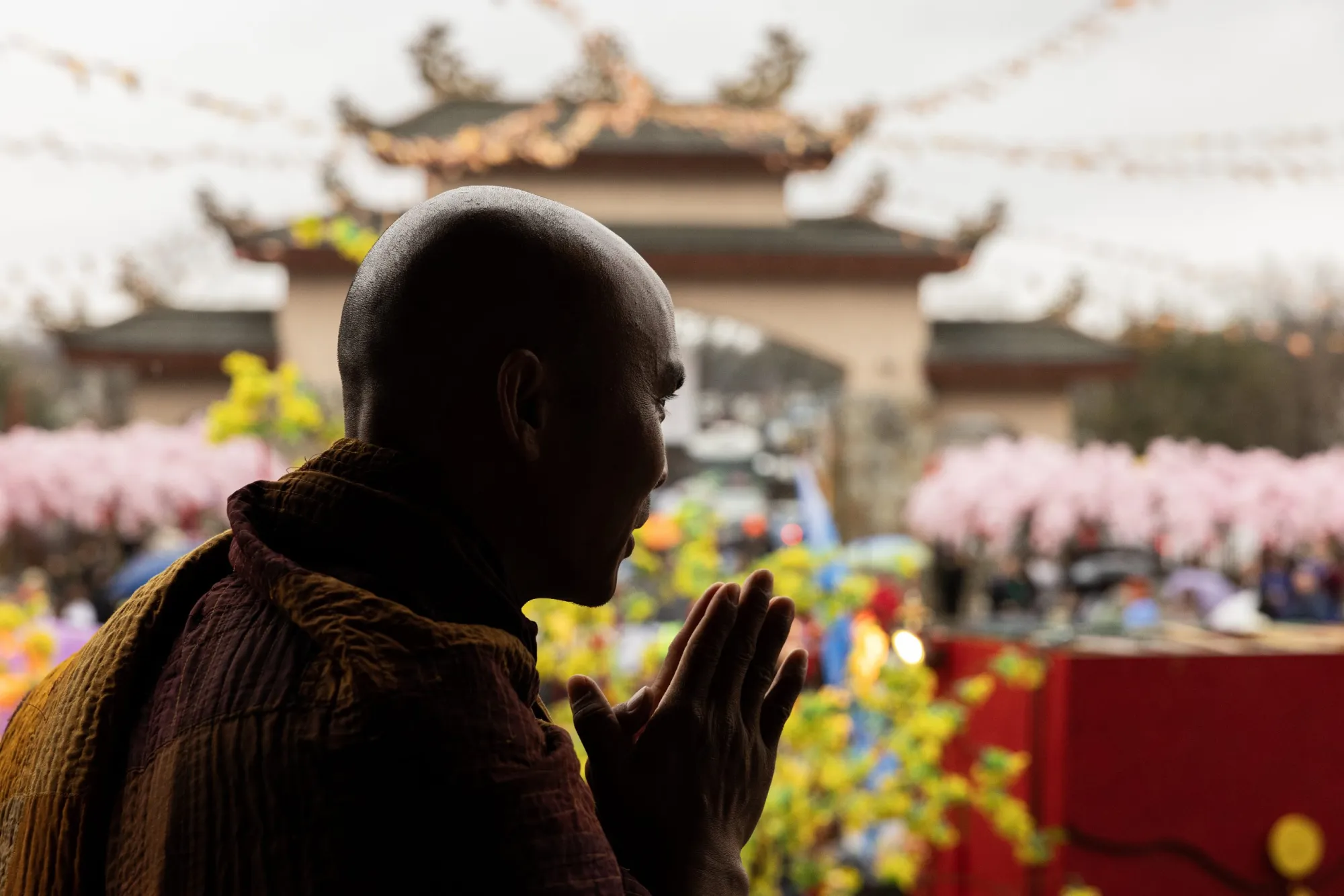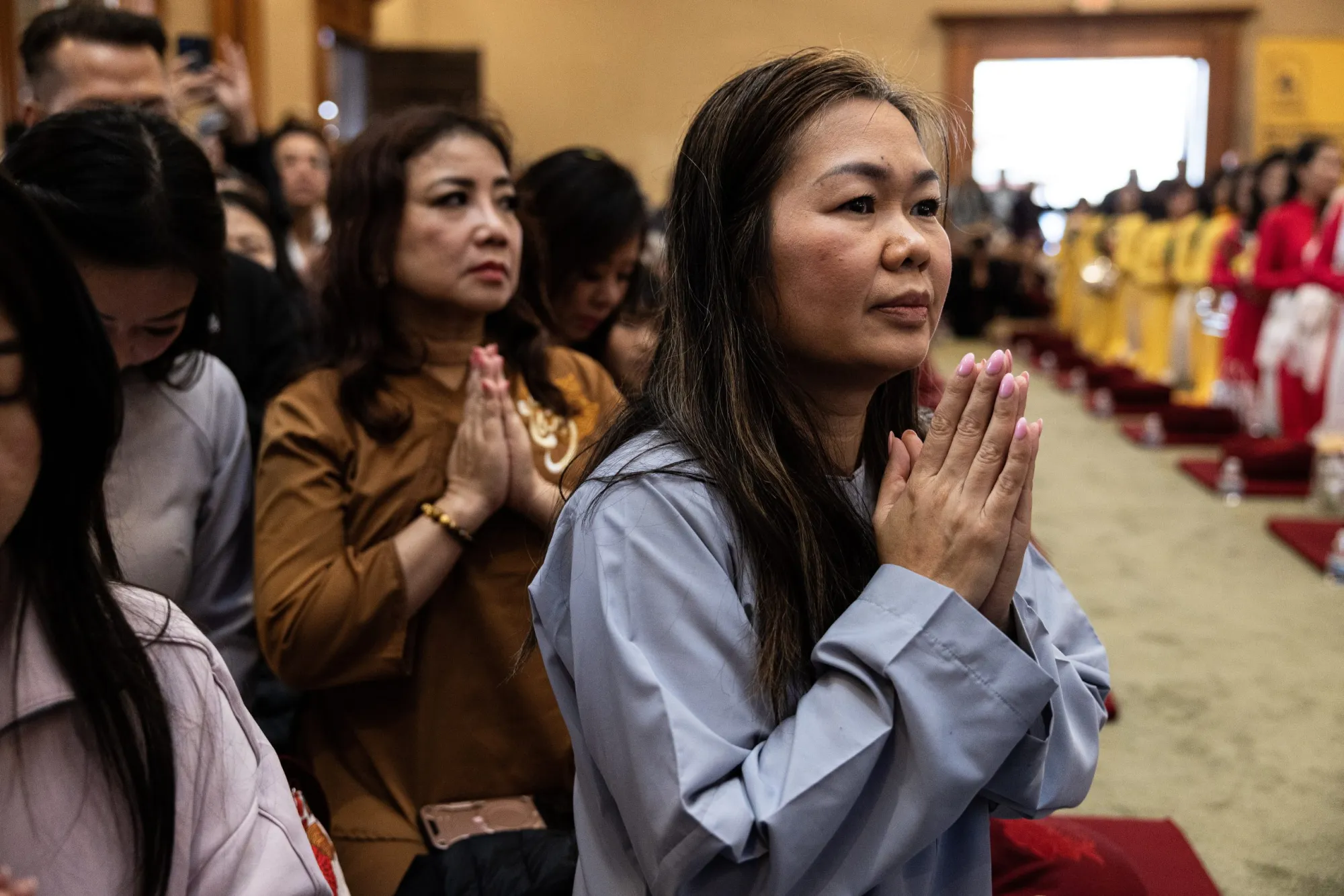 Yen Tran, miembro del templo, reza con los monjes durante su ceremonia de recepción en el Centro Huong Dao Vipassana Bhavana el 14 de febrero de 2026. (Maria Crane | Fort Worth Report/CatchLight Local/Report for America)