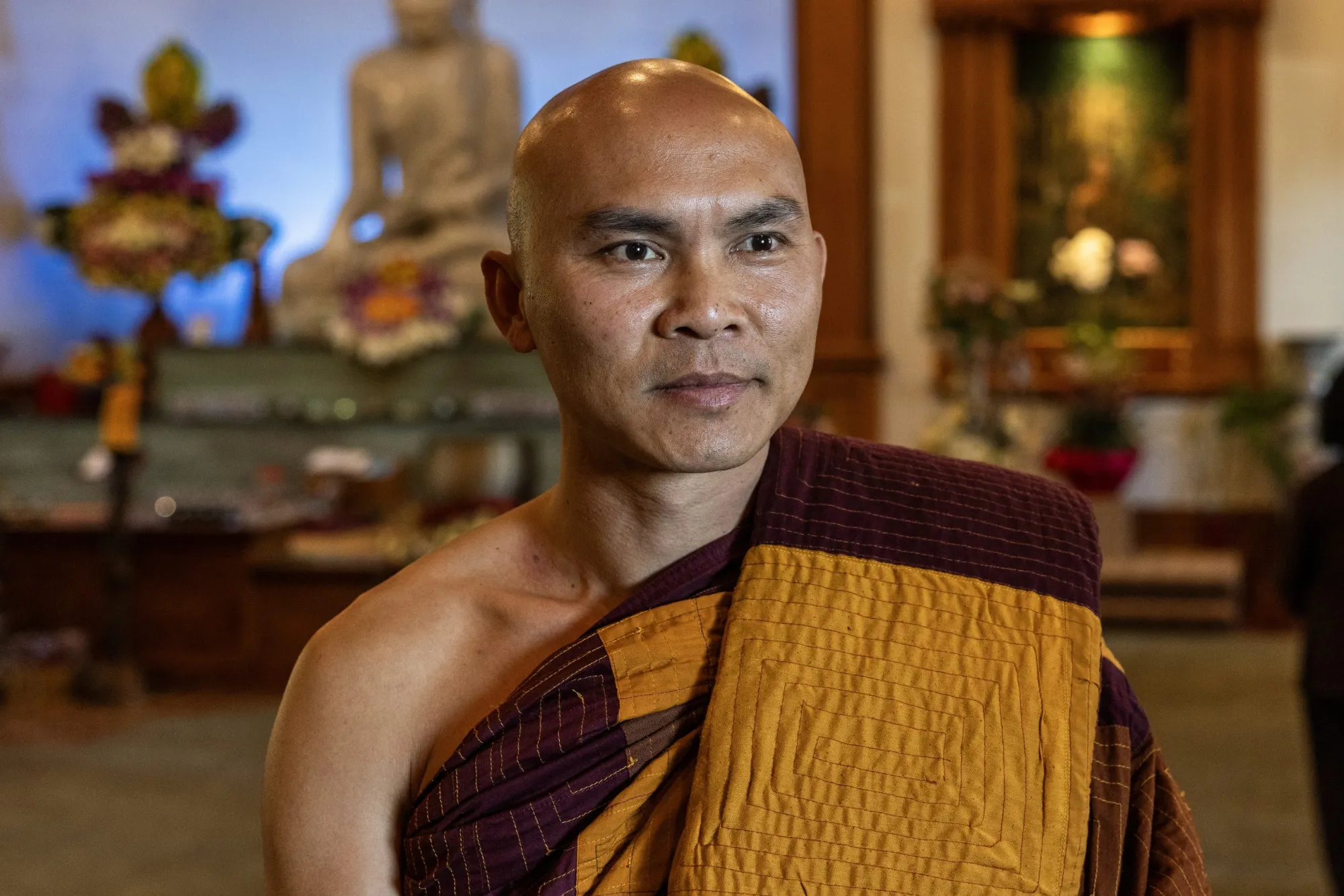 Tue Nhan Bhikkhu, vicepresidente del templo, también conocido como el Reverendo Nguyen, posa para una foto el 19 de octubre de 2025, tras la conferencia de prensa que anunció la Caminata por la Paz. (Maria Crane | Fort Worth Report/CatchLight Local/Report for America)