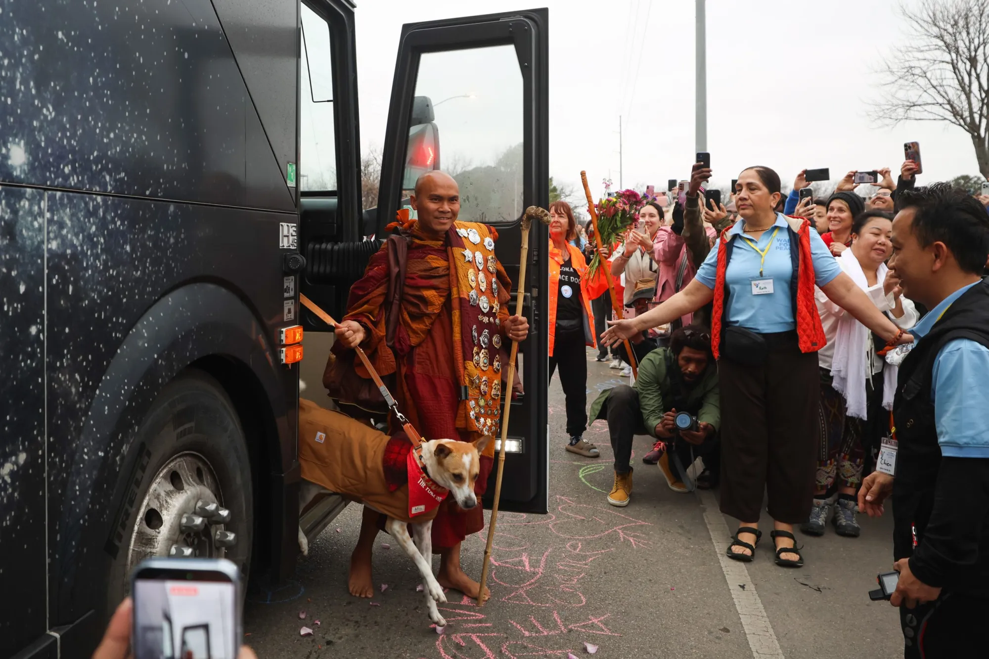 Bhikkhu Pannakara, también conocido como el Reverendo Nguyen, agradece a los cientos de millones de personas que presenciaron el viaje de 3700 kilómetros de los monjes por la paz. (Maria Crane | Fort Worth Report/CatchLight Local/Report for America)