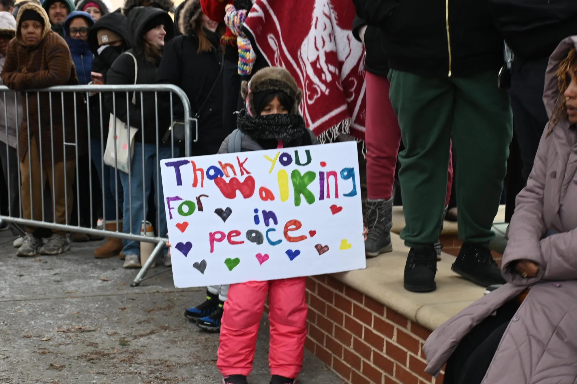 Un niño sostiene un cartel de paz durante la parada de los monjes en Raleigh, Carolina del Norte, el 24 de enero de 2026. (Walter Gómez | Enlace Latino NC)