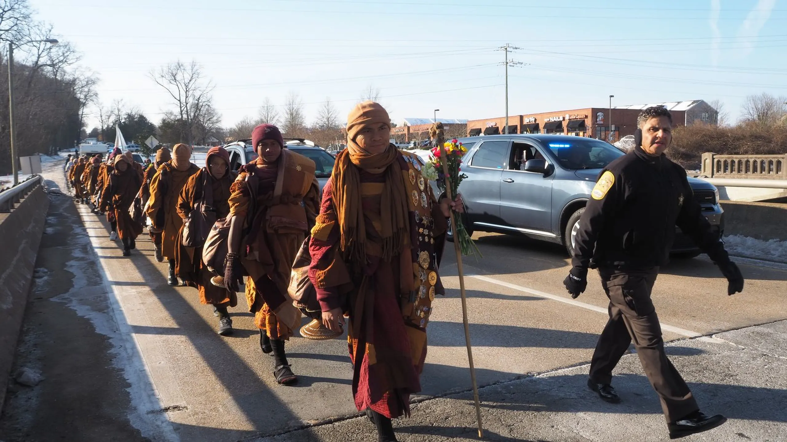 La Caminata por la Paz, liderada por el monje budista Bhikkhu Pannakara, de 44 años, pasa por el centro comercial Brook Run en el condado de Henrico el 3 de febrero de 2026. (Dina Weinstein | Henrico Citizen)