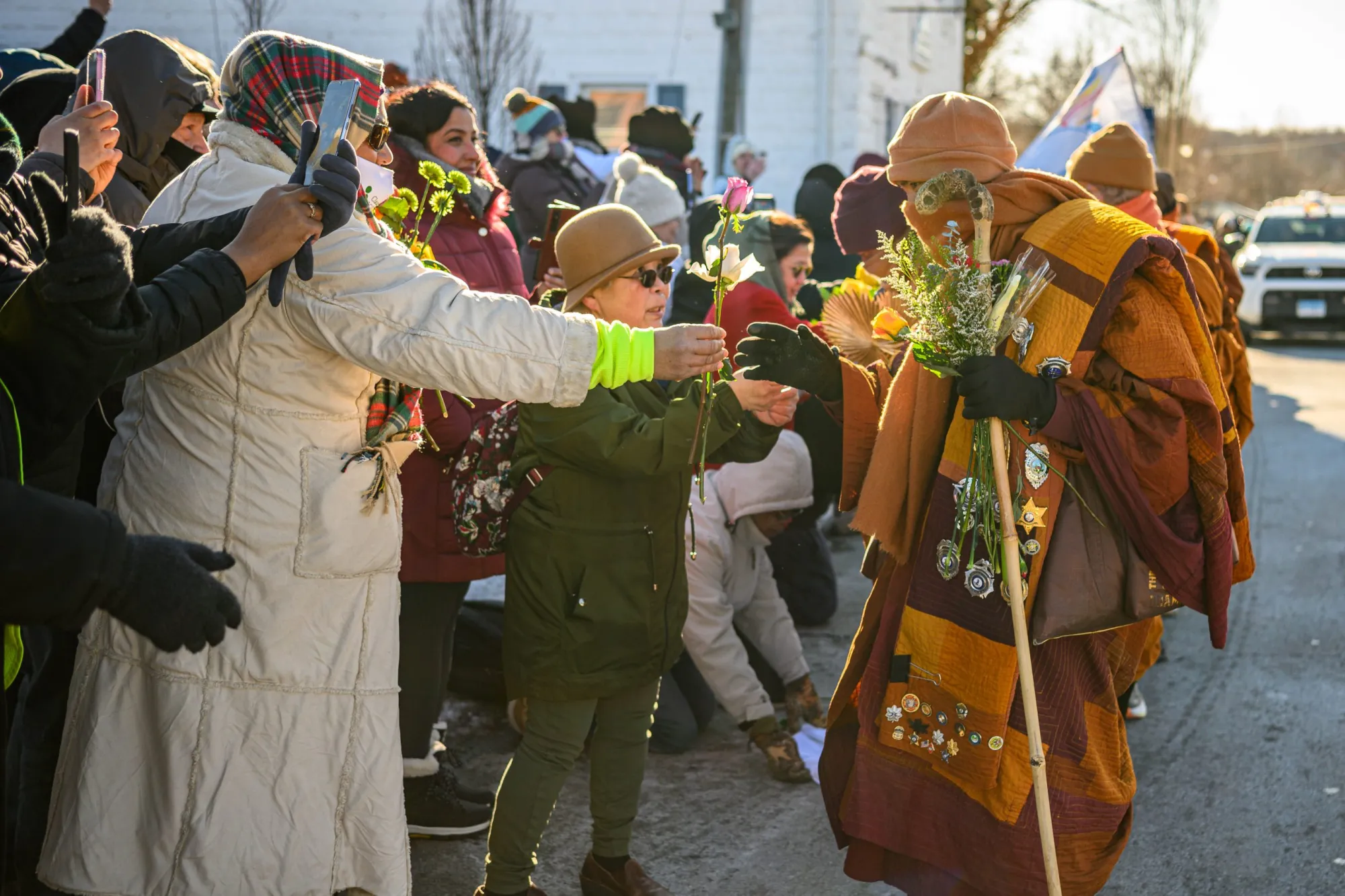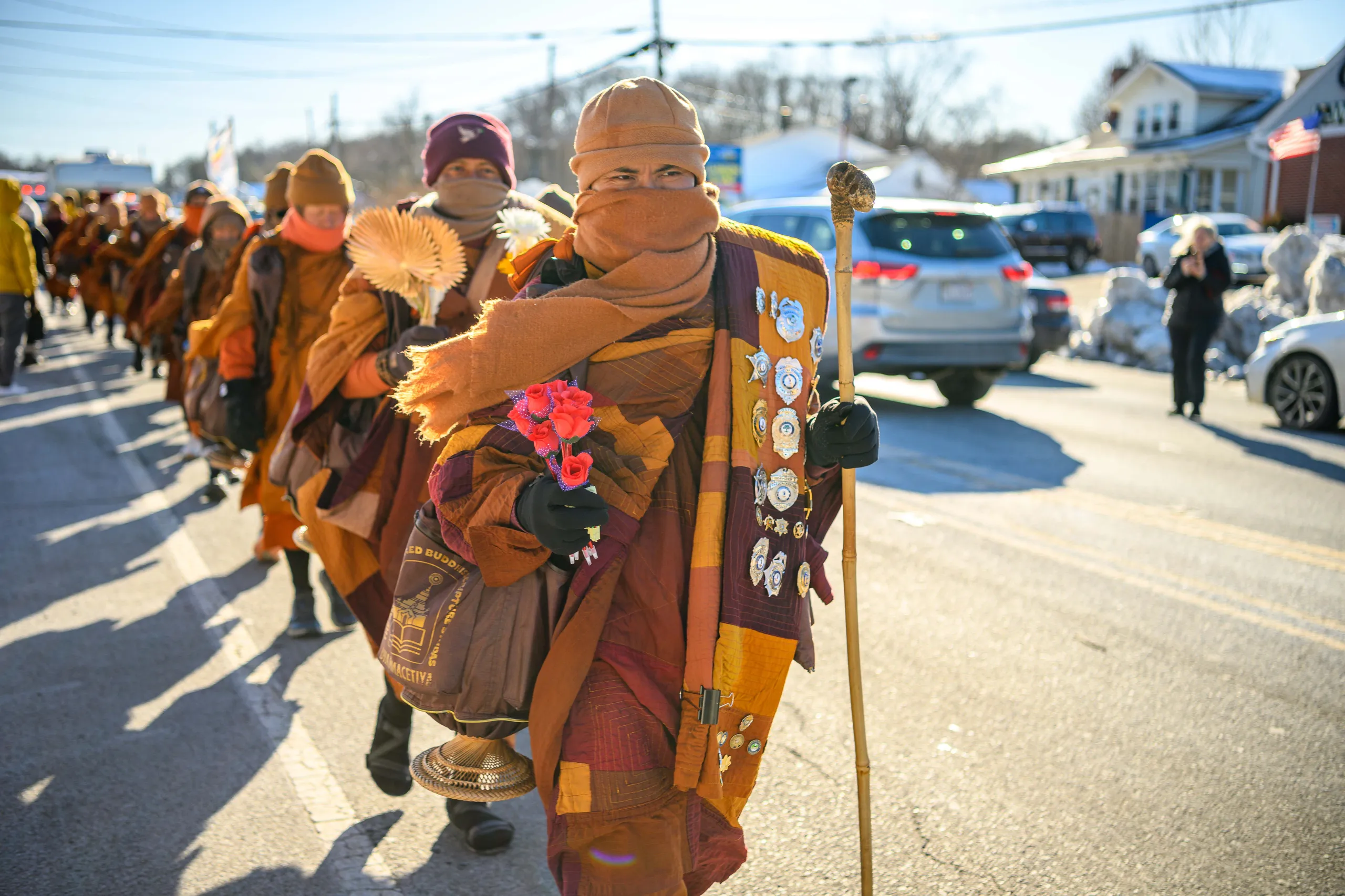Uno de los venerables monjes que participan en la Caminata por la Paz se abriga para soportar las gélidas temperaturas que el grupo soportó en su viaje por el sureste del condado de Prince William el 7 de febrero de 2026. (Doug Stroud para Prince William Times)
