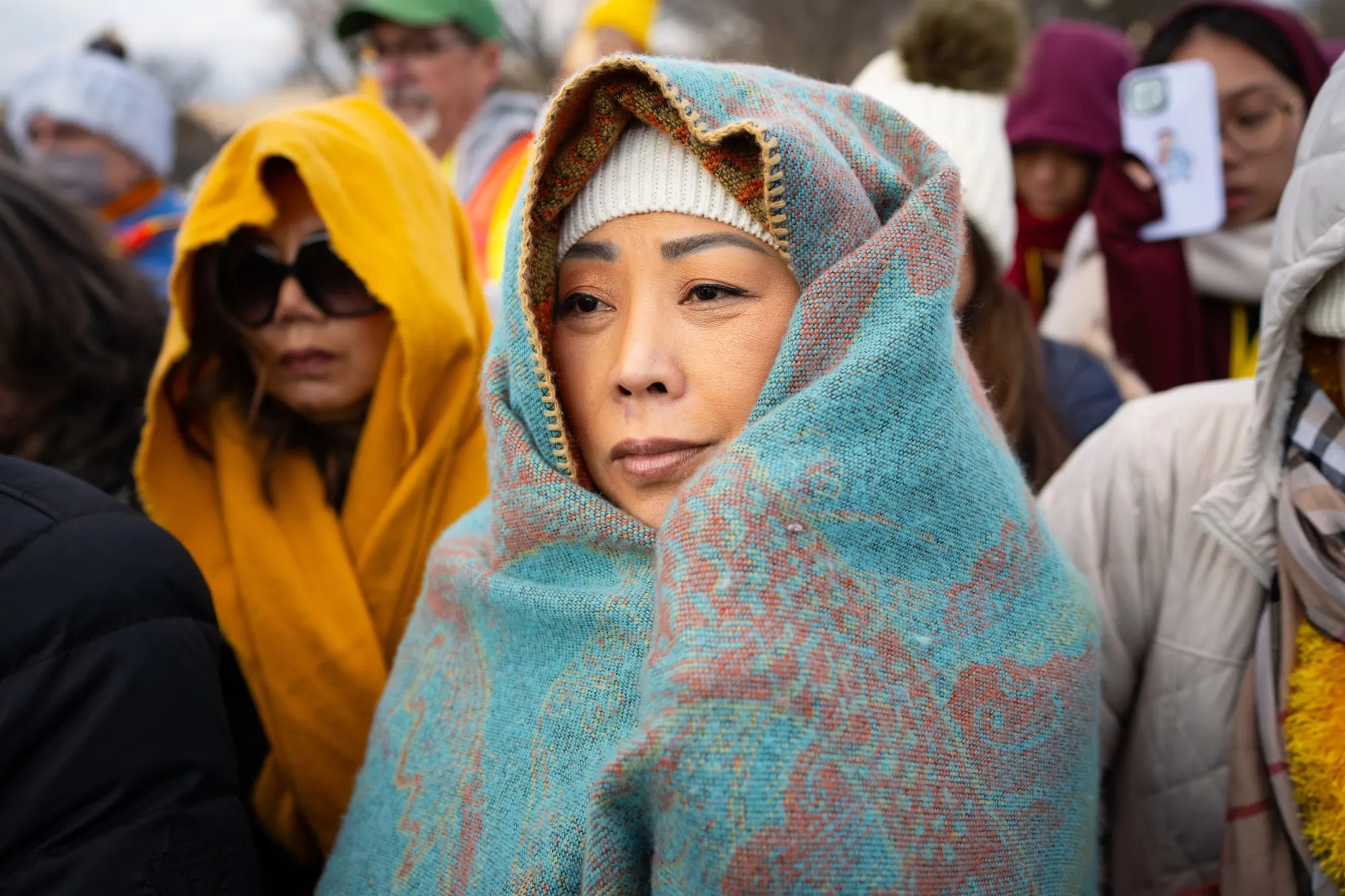 Monjes budistas que participan en la Caminata por la Paz llegan a la Catedral Nacional de Washington el martes 10 de febrero de 2026, en Washington, D.C. Miles de personas acudieron a verlos. (Sarah L. Voisin para Fort Worth Report)
